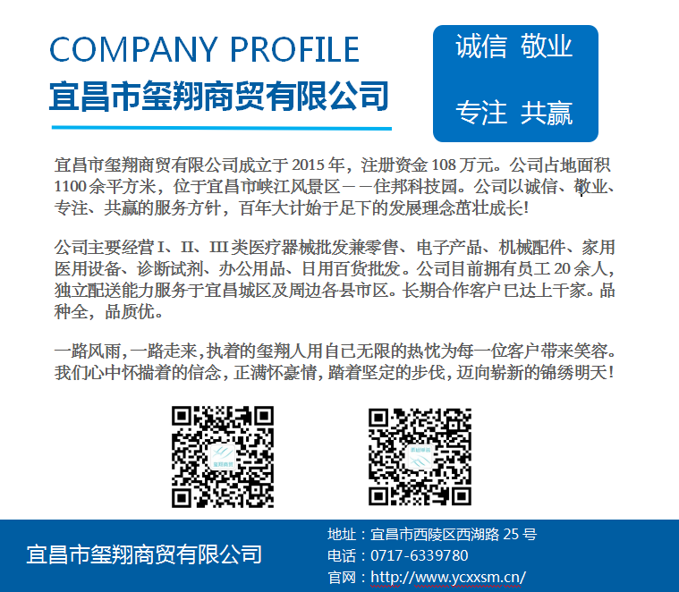 宜昌市璽翔商貿(mào)有限公司主要經(jīng)營(yíng)I、II、III類(lèi)醫(yī)療器械批發(fā)兼零售、電子產(chǎn)品、機(jī)械配件、家用醫(yī)用設(shè)備、診斷試劑、辦公用品、日用百貨批發(fā)。公司目前擁有員工20余人,獨(dú)立配送能力服務(wù)于宜昌城區(qū)及周邊各縣市區(qū)。